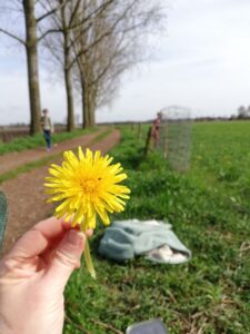 Dinsdag de hele dag binnen gezeten, dus de behoefte aan wat buitenlucht en zonneschijn was groot. Op woensdagmiddag komt het er niet van in verband met speelafspraken her en der. Dus dan maar integreren in wat toch al moet. Dit keer werd het lopend naar school om de kinderen op te halen en met de kinderen ook weer lopend terug naar huis. Met, een picknick onderweg. Een heel klein stukje het dorp uit om naast de groene weilanden te zitten, boterhammetjes mee en klaar is je mini NatuurAvontuur.